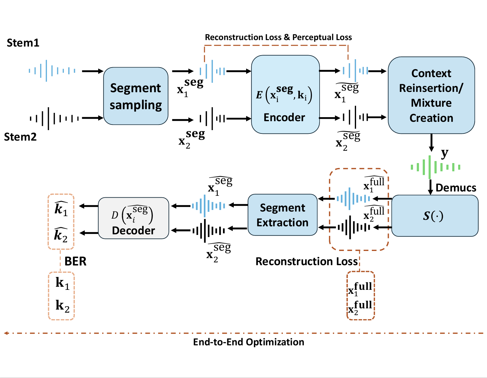 The examples below demonstrate the separation-first watermarking pipeline shown above. In each case, the left column corresponds to the Accompaniment stem and the right column corresponds to the Vocal stem. Each stem is independently watermarked with a different key and bit sequence. The watermarked stems are mixed, separated using the Demucs separator, and decoded from each separated stem. For each method (Baseline, Joint, Finetuned), we show the original stems, watermarked stems, embedded watermark bits, separated stems, and the decoded bits with BER. Incorrect bits are highlighted in red.